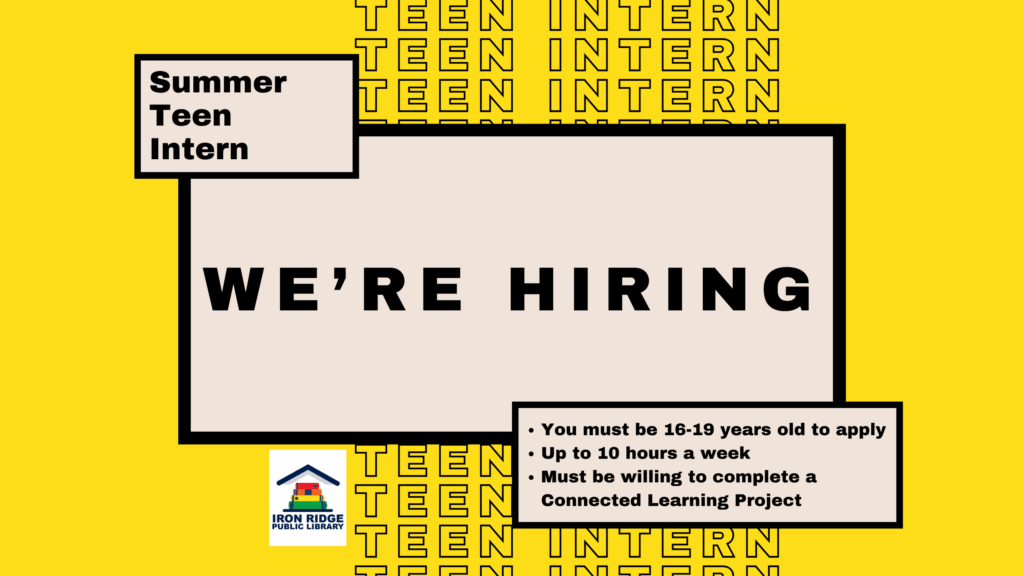 We are hiring a part time summer teen intern. Click the link below to download your application. Applications may be submitted in person at the library or emailed to Michelle O’Brien at ironridge@monarchlibraries.org. Please call with any questions you may have.